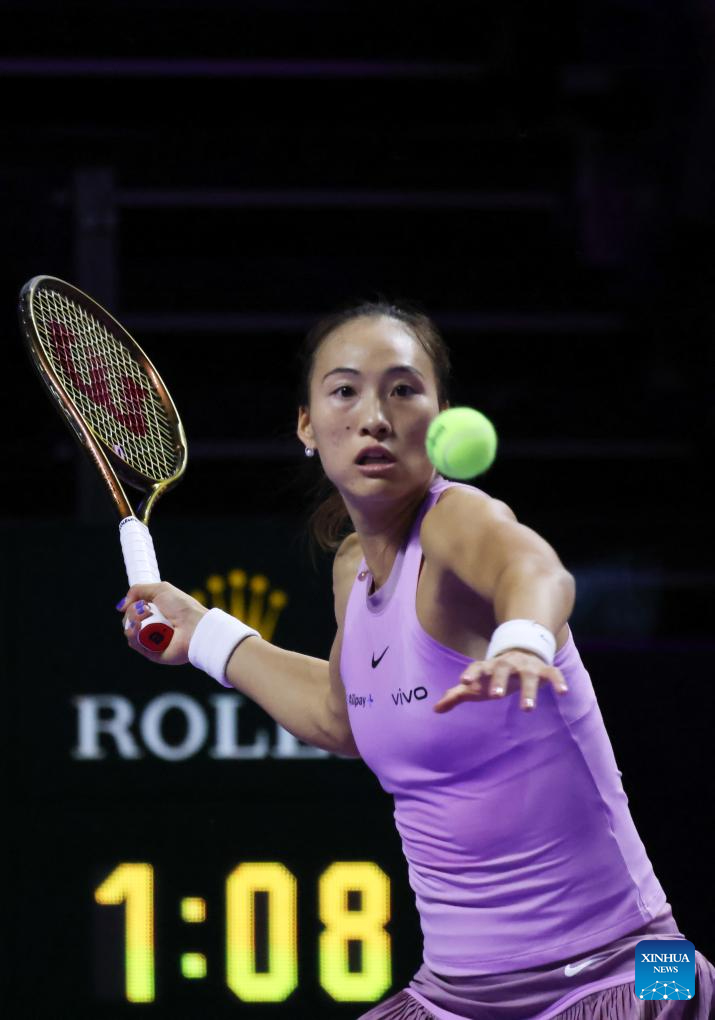 Zheng Qinwen of China hits a return during the semifinal match against Barbora Krejcikova of the Czech Republic at WTA Finals tennis tournament in Riyadh, Saudi Arabia, Nov. 8, 2024. (Xinhua/Wang Haizhou)