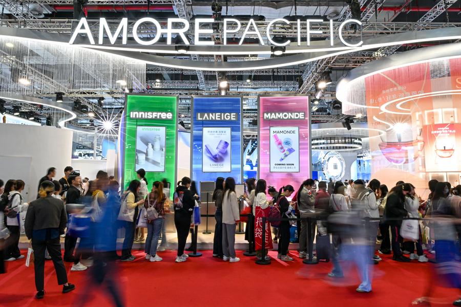 People visit the booth of Amore Pacific at the Consumer Goods Exhibition Area during the 7th China International Import Expo (CIIE) in east China's Shanghai, Nov. 7, 2024. (Xinhua/Zhang Cheng)