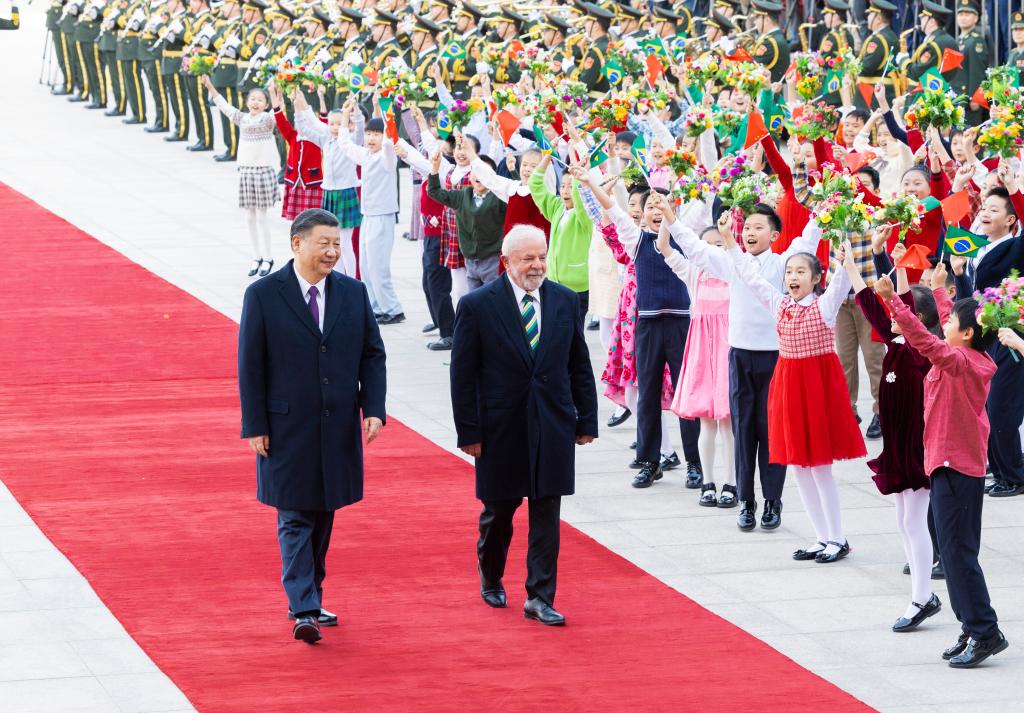 Chinese President Xi Jinping holds a welcoming ceremony for Brazilian President Luiz Inacio Lula da Silva at the square outside the east entrance of the Great Hall of the People prior to their talks in Beijing, capital of China, April 14, 2023. (Xinhua/Huang Jingwen)