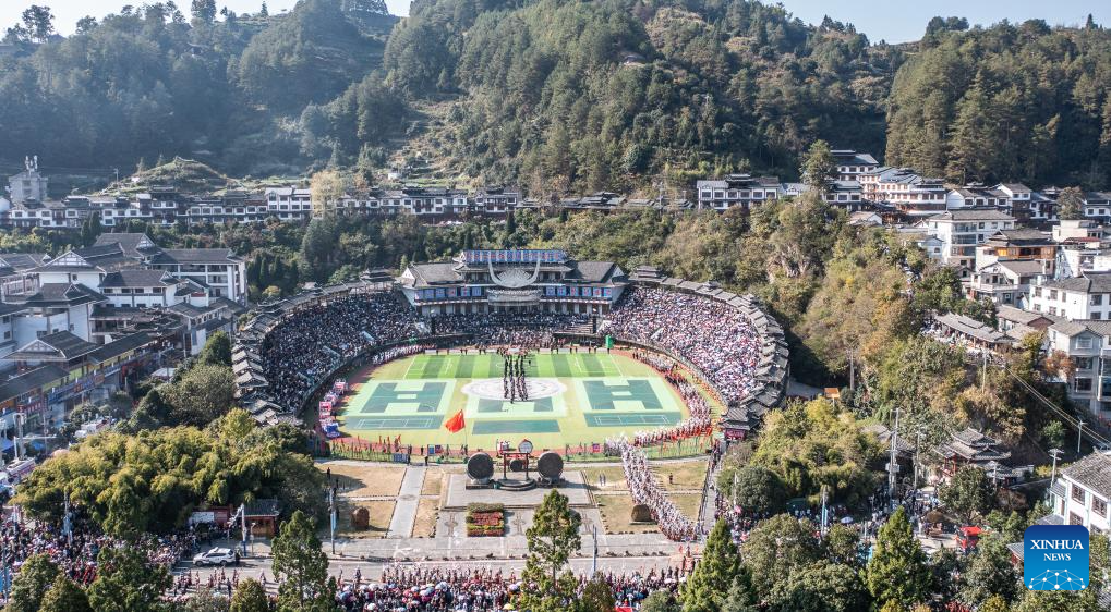 An aerial drone photo taken on Nov. 10, 2024 shows a view of the celebration of the Miao New Year at Leishan County of Qiandongnan Miao and Dong Autonomous Prefecture, southwest China's Guizhou Province. Miao New Year is a major festival of people of Miao ethnic group. In 2008, the festival was listed as a national-level intangible cultural heritage. (Xinhua/Tao Liang)