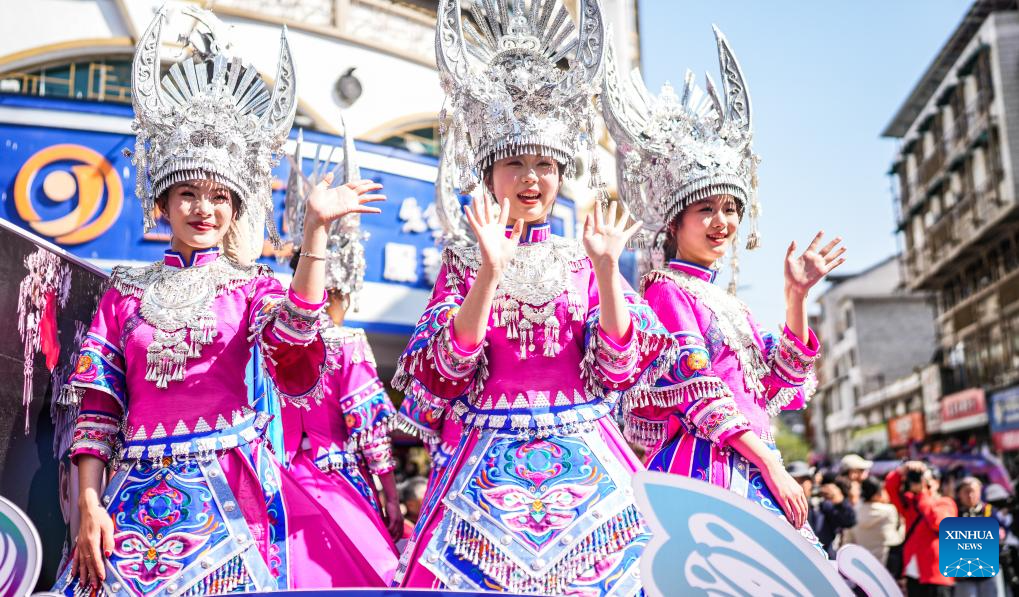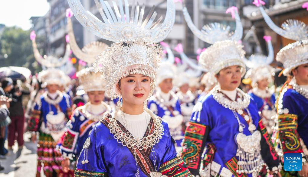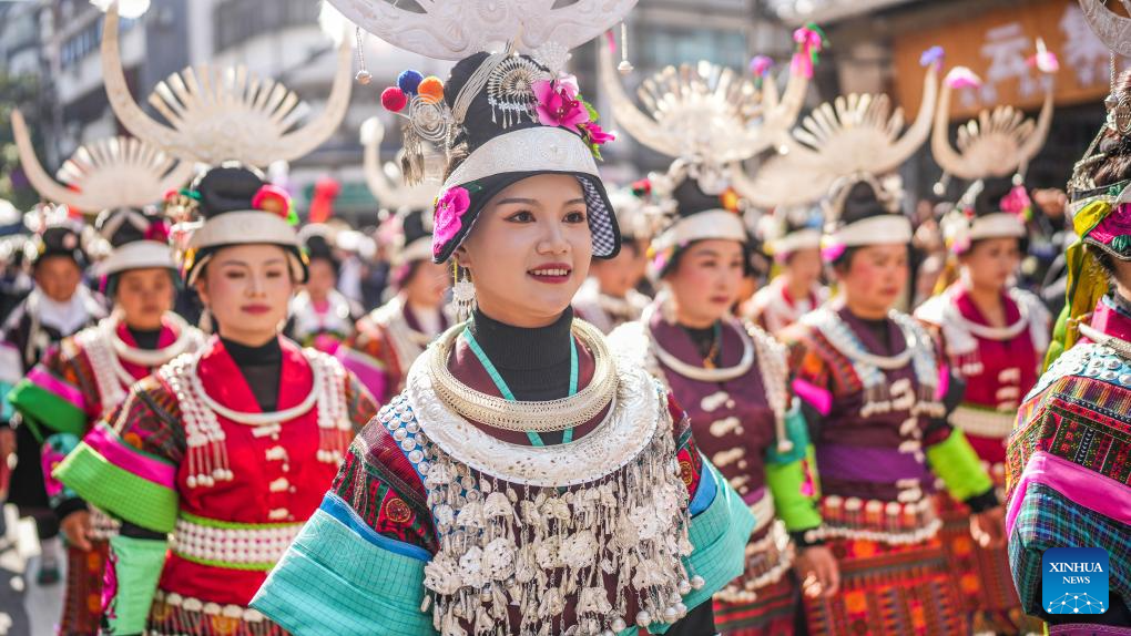 People of Miao ethnic group in traditional costumes take part in a parade to celebrate the Miao New Year at Leishan County of Qiandongnan Miao and Dong Autonomous Prefecture, southwest China's Guizhou Province, Nov. 10, 2024. Miao New Year is a major festival of people of Miao ethnic group. In 2008, the festival was listed as a national-level intangible cultural heritage. (Xinhua/Tao Liang)