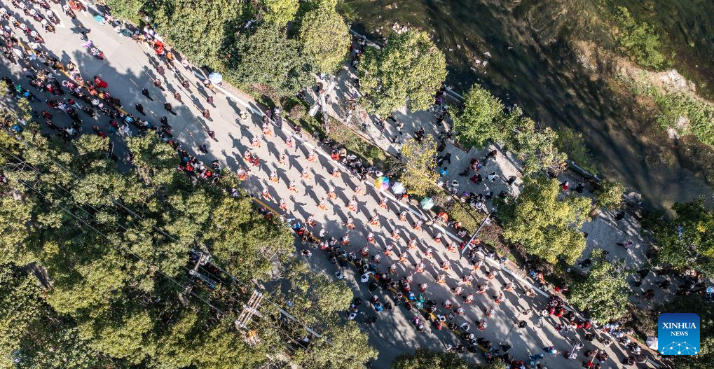 An aerial drone photo taken on Nov. 10, 2024 shows people of Miao ethnic group in traditional costumes taking part in a parade to celebrate the Miao New Year at Leishan County of Qiandongnan Miao and Dong Autonomous Prefecture, southwest China's Guizhou Province. Miao New Year is a major festival of people of Miao ethnic group. In 2008, the festival was listed as a national-level intangible cultural heritage. (Xinhua/Tao Liang)