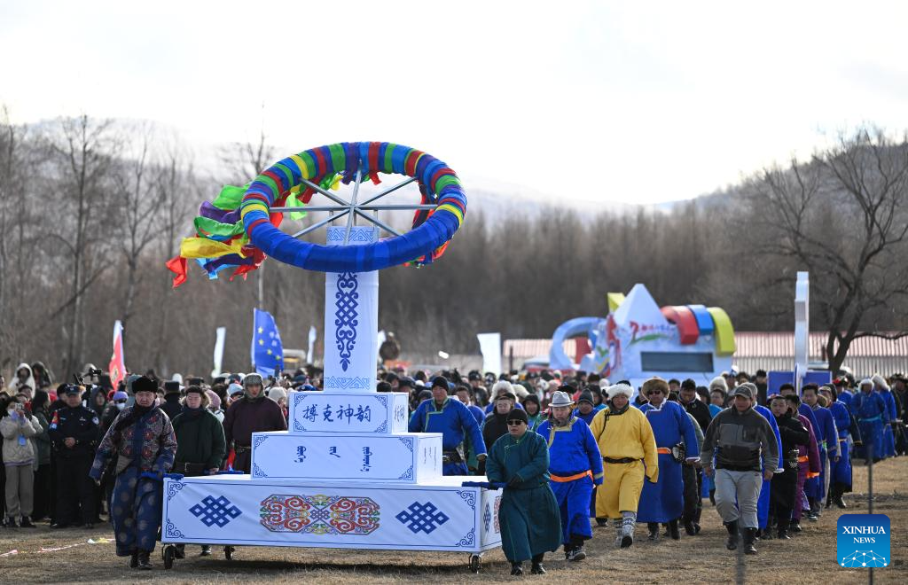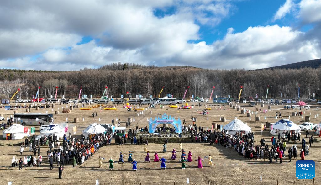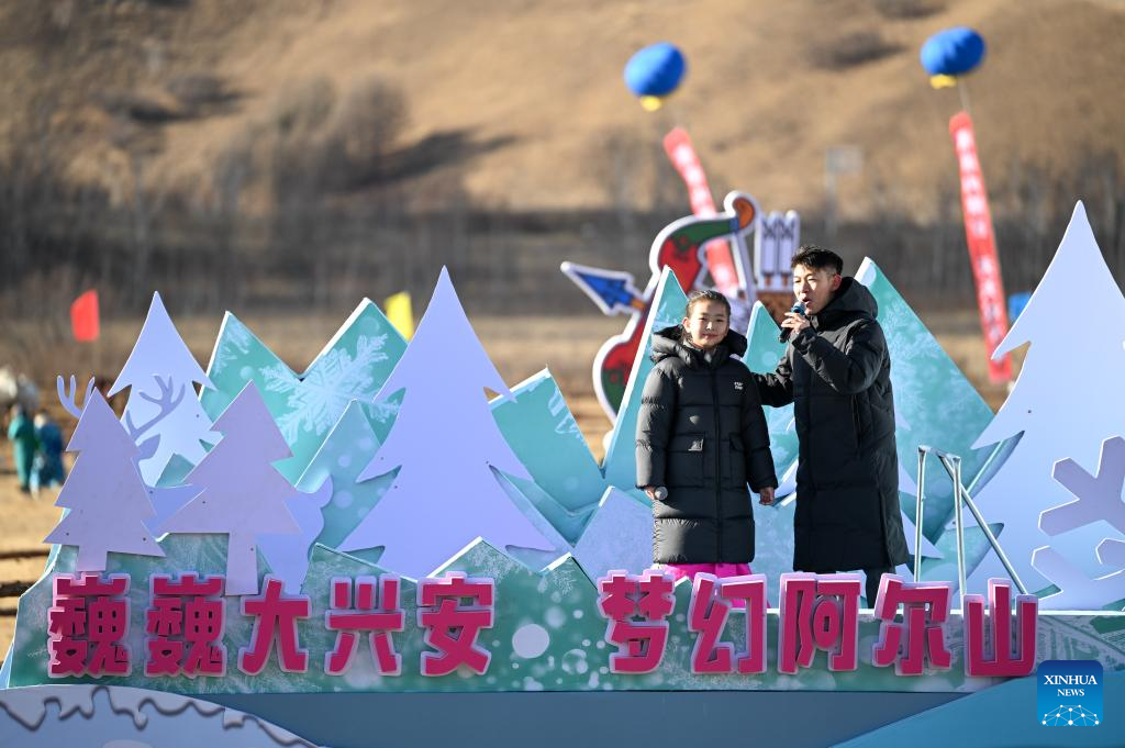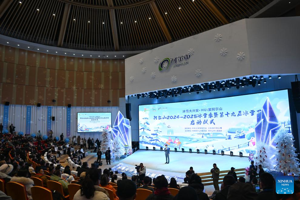 The opening ceremony of the Arxan 2024-2025 ice and snow season and 19th ice and snow festival is held in Arxan of Hinggan League, north China's Inner Mongolia Autonomous Region, on Nov. 10, 2024. The opening ceremony of the Arxan 2024-2025 ice and snow season and 19th ice and snow festival was held here on Sunday. Throughout the ice and snow season, Arxan will host a variety of activities to attract visitors. (Xinhua/Bei He)
