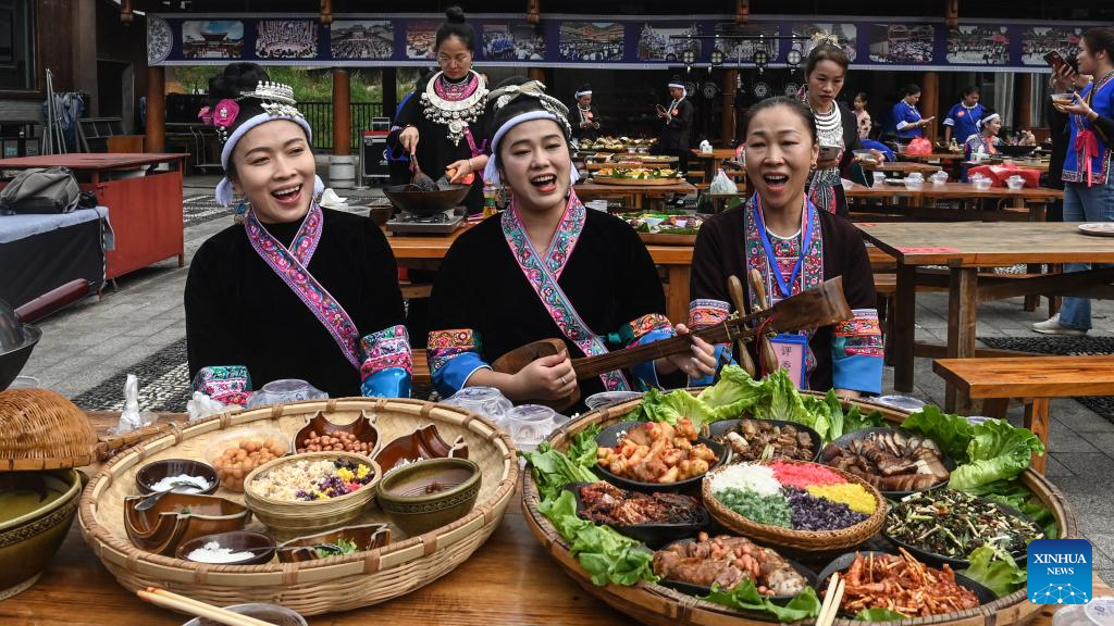 Women perform during an oil tea feast at Yueye Dong Village, Sanjiang Dong Autonomous County, south China's Guangxi Zhuang Autonomous Region, Nov. 9, 2024. Various activities including dancing, oil tea feast, and folk art performances were held here on Saturday to celebrate the traditional Duoye festival, an occasion during which the Dong people used to gather around in a circle to chant their prayers. (Xinhua/Zhang Ailin)