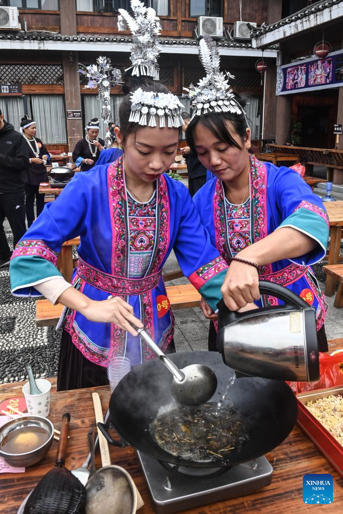 Women brew oil tea at Yueye Dong Village, Sanjiang Dong Autonomous County, south China's Guangxi Zhuang Autonomous Region, Nov. 9, 2024. Various activities including dancing, oil tea feast, and folk art performances were held here on Saturday to celebrate the traditional Duoye festival, an occasion during which the Dong people used to gather around in a circle to chant their prayers. (Xinhua/Zhang Ailin)