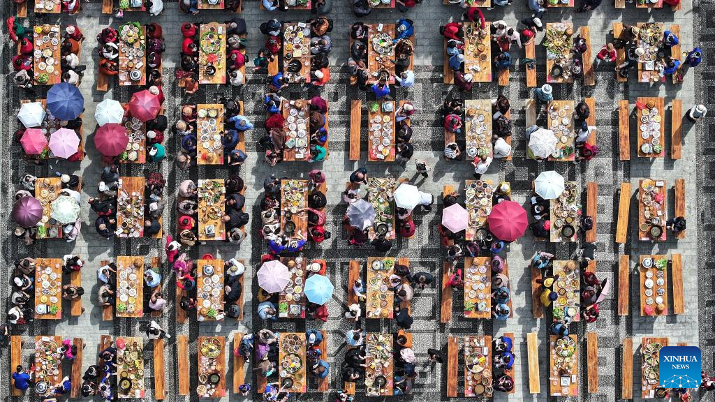 An aerial drone photo shows guests attending an oil tea feast at Yueye Dong Village, Sanjiang Dong Autonomous County, south China's Guangxi Zhuang Autonomous Region, Nov. 9, 2024. Various activities including dancing, oil tea feast, and folk art performances were held here on Saturday to celebrate the traditional Duoye festival, an occasion during which the Dong people used to gather around in a circle to chant their prayers. (Xinhua/Zhang Ailin)