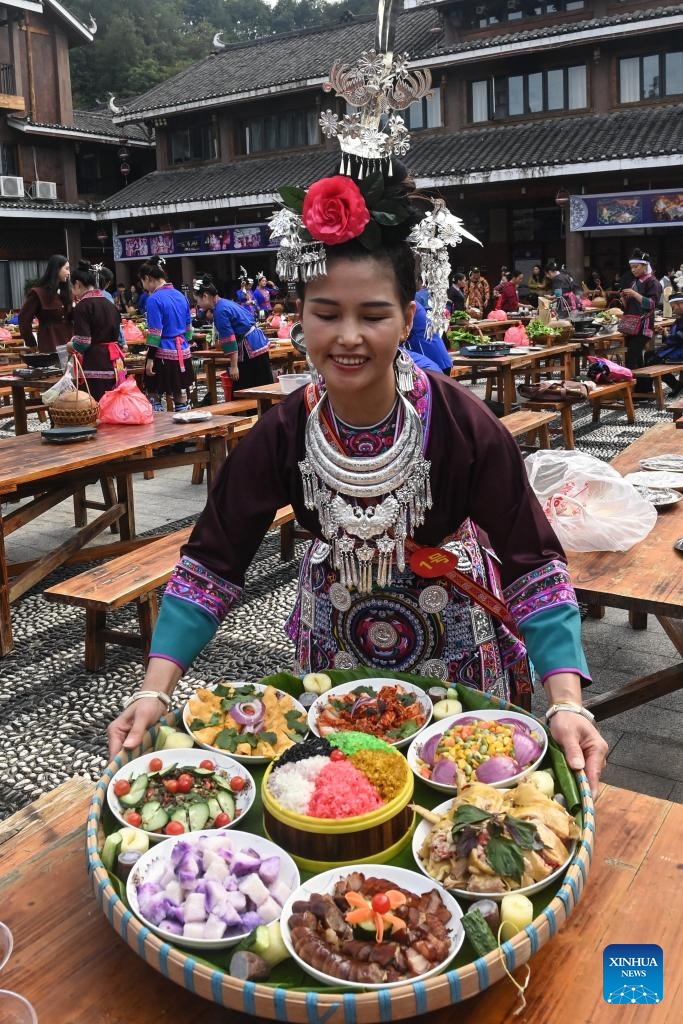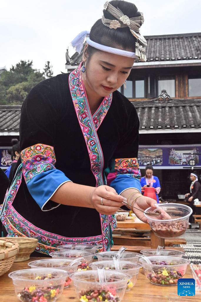 A woman serves delicacies for an oil tea feast at Yueye Dong Village, Sanjiang Dong Autonomous County, south China's Guangxi Zhuang Autonomous Region, Nov. 9, 2024. Various activities including dancing, oil tea feast, and folk art performances were held here on Saturday to celebrate the traditional Duoye festival, an occasion during which the Dong people used to gather around in circles to chant their prayers. (Xinhua/Zhang Ailin)