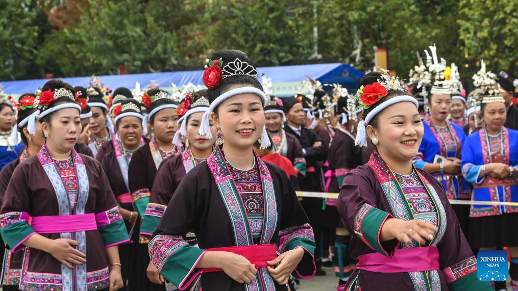 People attend a celebration of Duoye festival at Duoye Square in Sanjiang Dong Autonomous County, south China's Guangxi Zhuang Autonomous Region, Nov. 9, 2024. Various activities including dancing, oil tea feast, and folk art performances were held here on Saturday to celebrate the traditional Duoye festival, an occasion during which the Dong people used to gather around in a circle to chant their prayers. (Xinhua/Zhang Ailin)