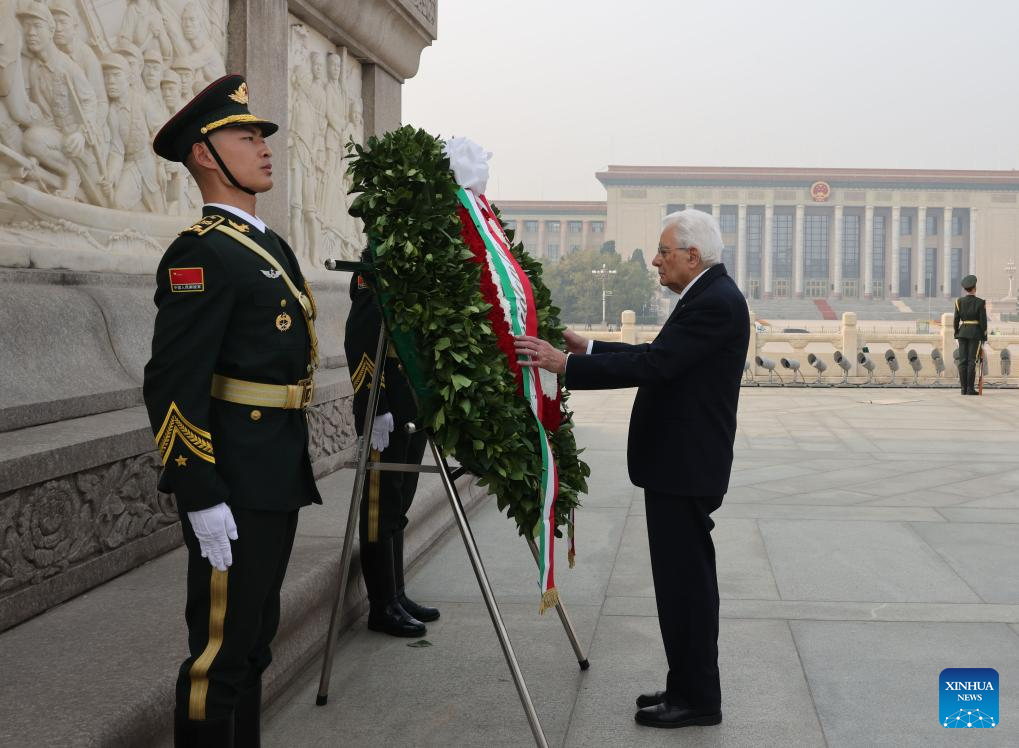 Italian president lays wreath at Monument to People's Heroes in Beijing
