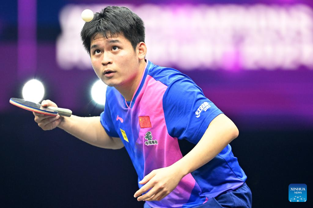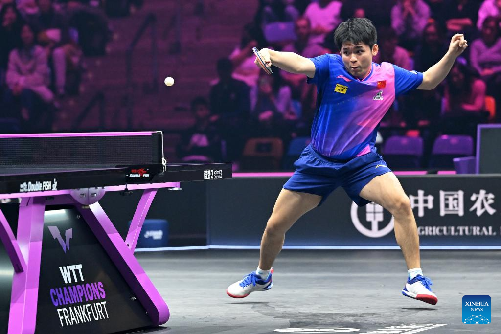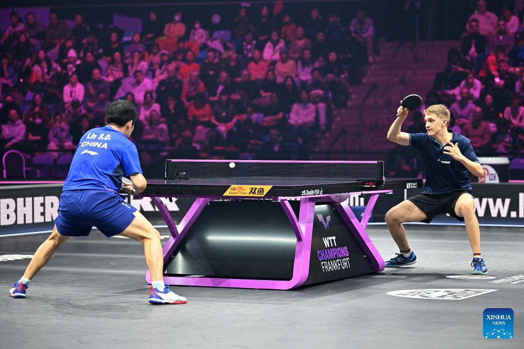 Lin Shidong of China hits a return during the men's singles final against Anton Kallberg of Sweden at World Table Tennis (WTT) Champions Frankfurt 2024 in Frankfurt, Germany, Nov. 10, 2024. (Photo by Ulrich Hufnagel/Xinhua)