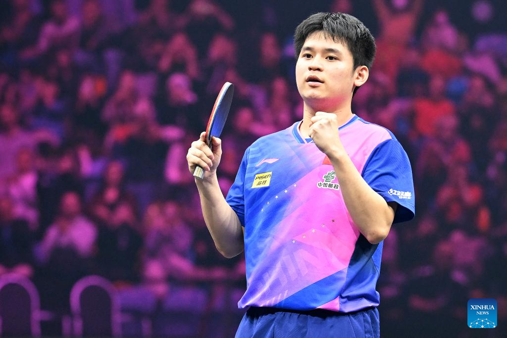 Lin Shidong of China celebrates during the men's singles final against Anton Kallberg of Sweden at World Table Tennis (WTT) Champions Frankfurt 2024 in Frankfurt, Germany, Nov. 10, 2024. (Photo by Ulrich Hufnagel/Xinhua)