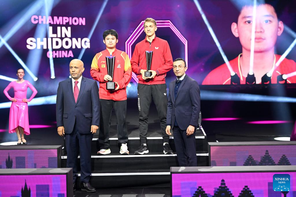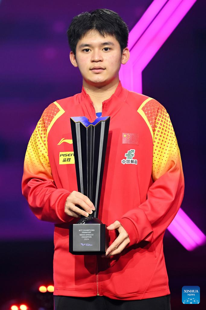 Lin Shidong (R) of China poses with his trophy during the victory ceremony for the men's singles at World Table Tennis (WTT) Champions Frankfurt 2024 in Frankfurt, Germany, Nov. 10, 2024. (Photo by Ulrich Hufnagel/Xinhua)