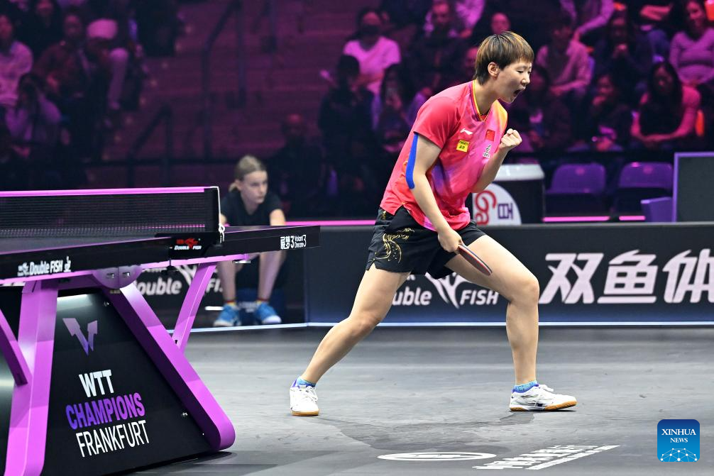 Wang Manyu of China celebrates during the women's singles final against Wang Yidi of China at World Table Tennis (WTT) Champions Frankfurt 2024 in Frankfurt, Germany, Nov. 10, 2024. (Photo by Ulrich Hufnagel/Xinhua)