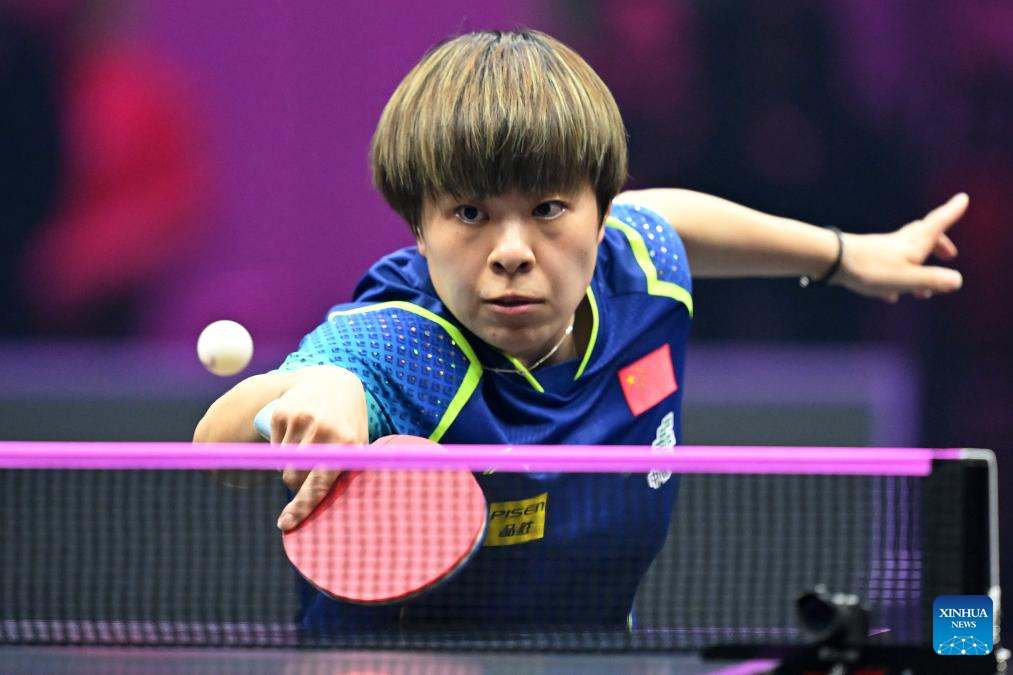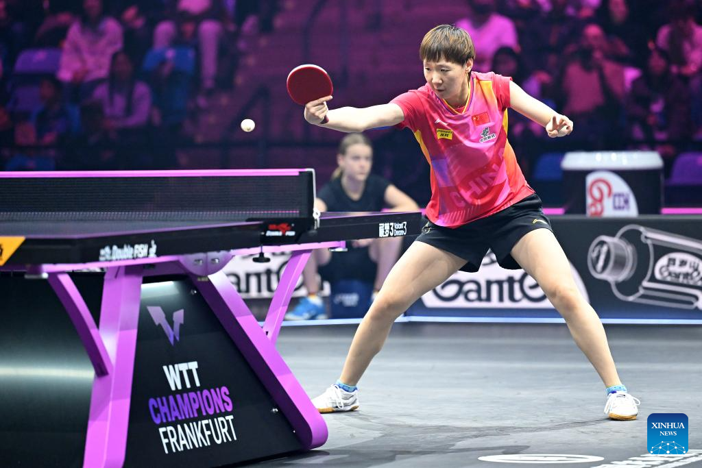 Wang Yidi of China hits a return during the women's singles final against Wang Manyu of China at World Table Tennis (WTT) Champions Frankfurt 2024 in Frankfurt, Germany, Nov. 10, 2024. (Photo by Ulrich Hufnagel/Xinhua)