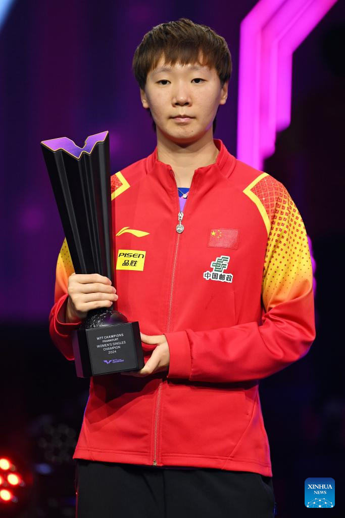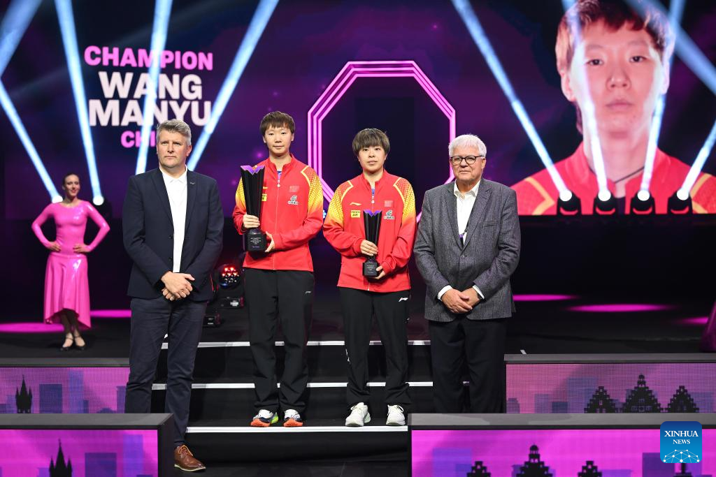 Champion Wang Manyu (R) of China poses with her trophy during the victory ceremony for the women's singles at World Table Tennis (WTT) Champions Frankfurt 2024 in Frankfurt, Germany, Nov. 10, 2024. (Photo by Ulrich Hufnagel/Xinhua)