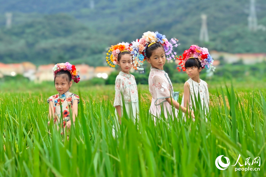 Young girls with hair-pinned flowers wander through the rice field in Tiantou village, Jimei district, Xiamen city, southeast China's Fujian Province. (People's Daily Online/Chen Bo)