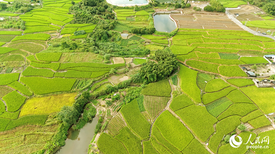 Recently, in Tiantou village, Jimei district, Xiamen, southeast China's Fujian Province, over 600 mu (about 40 hectares) of late-season rice has begun to head and ripen, with the grains gradually turning a soft yellow. Shades of light green, emerald, pale yellow, and amber blend together, creating a patchwork of colors that, when viewed from above, resemble a palette spread across the land.