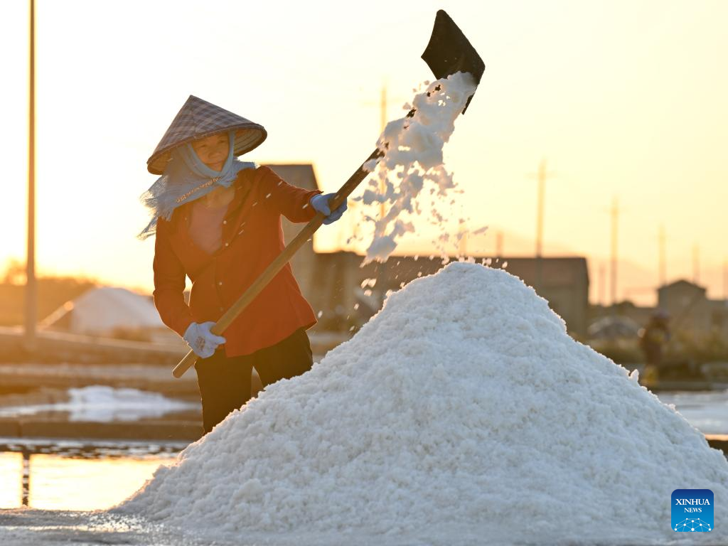 A worker operates at Shanyao salt field in Quanzhou City, southeast China's Fujian Province, Nov. 8, 2024. Covering an area of 920 hectares, the Shanyao salt field adheres to the traditional sun-drying techniques, and annually turns out 65,000 tonnes of sea salt. The Fujian traditional sun-drying techniques for sea salt production (Quanzhou style) was inscribed in the list of provincial intangible cultural heritage in 2022. (Xinhua/Jiang Kehong)