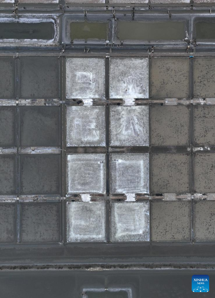 An aerial drone photo taken on Nov. 9, 2024 shows a view of Shanyao salt field in Quanzhou City, southeast China's Fujian Province. Covering an area of 920 hectares, the Shanyao salt field adheres to the traditional sun-drying techniques, and annually turns out 65,000 tonnes of sea salt. The Fujian traditional sun-drying techniques for sea salt production (Quanzhou style) was inscribed in the list of provincial intangible cultural heritage in 2022. (Xinhua/Jiang Kehong)