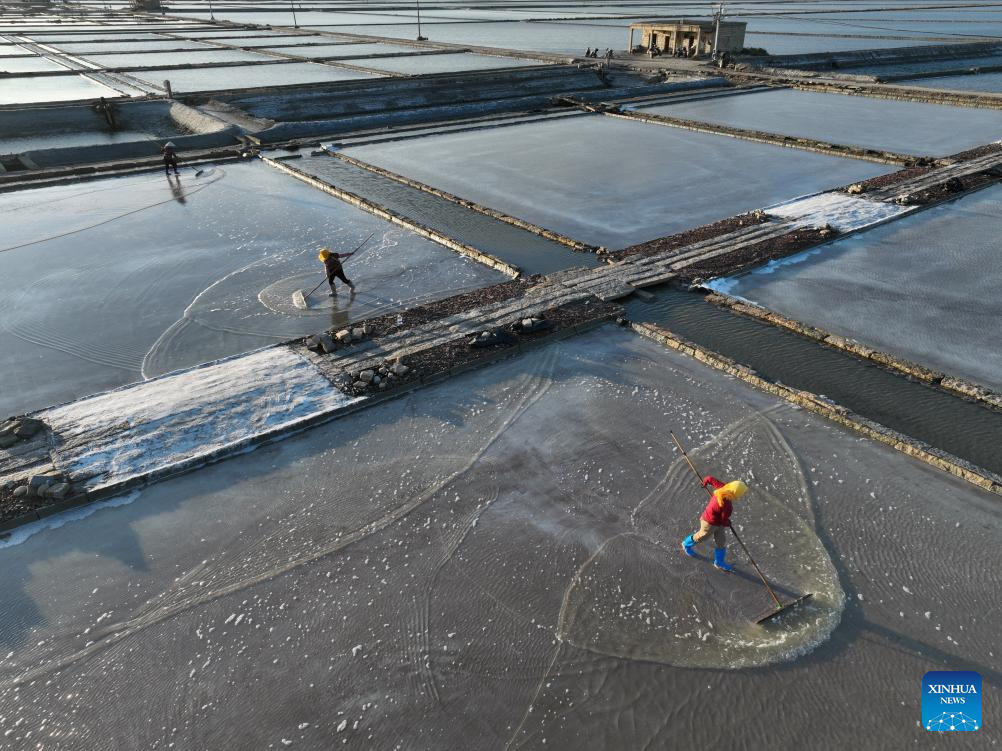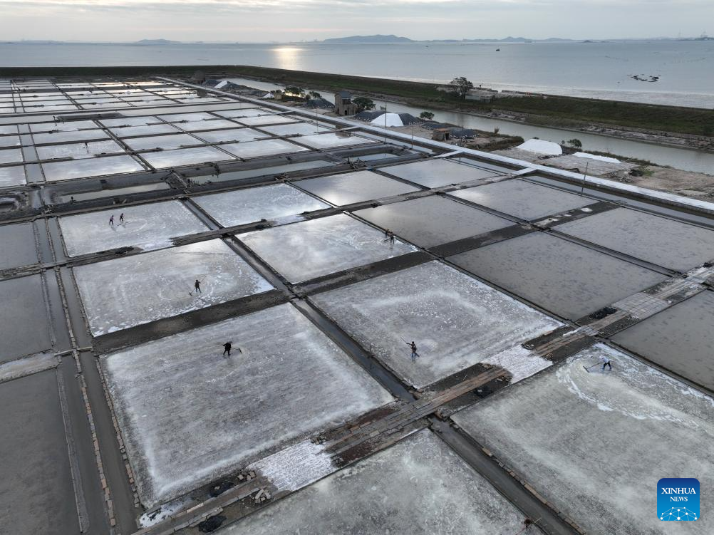 An aerial drone photo taken on Nov. 8, 2024 shows people working at Shanyao salt field in Quanzhou City, southeast China's Fujian Province. Covering an area of 920 hectares, the Shanyao salt field adheres to the traditional sun-drying techniques, and annually turns out 65,000 tonnes of sea salt. The Fujian traditional sun-drying techniques for sea salt production (Quanzhou style) was inscribed in the list of provincial intangible cultural heritage in 2022. (Xinhua/Jiang Kehong)