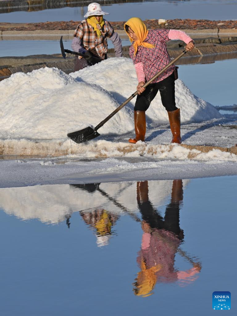 Workers transfer crude salt at Shanyao salt field in Quanzhou City, southeast China's Fujian Province, Nov. 9, 2024. Covering an area of 920 hectares, the Shanyao salt field adheres to the traditional sun-drying techniques, and annually turns out 65,000 tonnes of sea salt. The Fujian traditional sun-drying techniques for sea salt production (Quanzhou style) was inscribed in the list of provincial intangible cultural heritage in 2022. (Xinhua/Jiang Kehong)