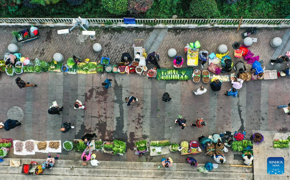 An aerial drone photo taken on Nov. 11, 2024 shows people shopping for fresh vegetables transported here by Bus No. 252 in Yunyan District of Guiyang City, southwest China's Guizhou Province. Bus No. 252, running between a rural area and urban district of Guiyang City, opened a special line in June this year to facilitate villagers along the line to sell their agricultural products.(Xinhua/Yang Wenbin)