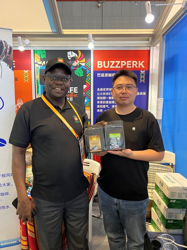Joseph Nkandu, a coffee farmer from Uganda and executive director of the Uganda Coffee Farmers Association, with his Chinese partner at their booth. (People's Daily Online)