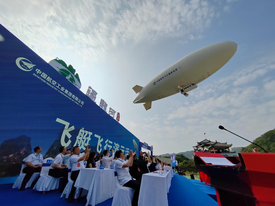 China's first homegrown AS700 civil manned airship is pictured during its demonstration flight in Yangshuo County in Guilin, south China's Guangxi Zhuang Autonomous Region, Sept. 14, 2024. (The Special Vehicle Research Institute under the Aviation Industry Corporation of China/Handout via Xinhua)