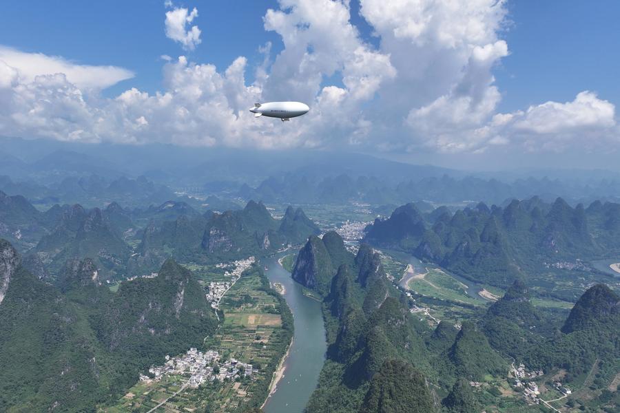 An aerial drone photo shows China's first homegrown AS700 civil manned airship during its demonstration flight in Yangshuo County in Guilin, south China's Guangxi Zhuang Autonomous Region, Sept. 14, 2024. (The Special Vehicle Research Institute under the Aviation Industry Corporation of China/Handout via Xinhua)