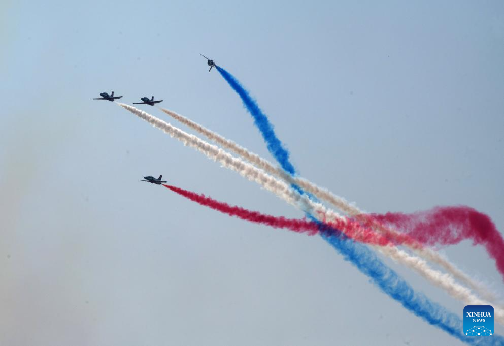 Aircraft of China's Red Falcon Aerobatic Team stage a performance during Airshow China in Zhuhai, south China's Guangdong Province, Nov. 12, 2024. The 15th China International Aviation and Aerospace Exhibition, also known as Airshow China, kicked off in Zhuhai on Tuesday. (Xinhua/Lu Hanxin)