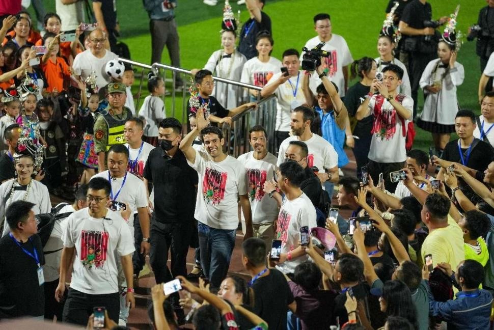 Former Brazilian soccer star Ricardo Kaka waves to soccer fans in a stadium in Rongjiang county, southwest China's Guizhou province, May 27, 2024. (People's Daily Online/Yang Wenshu)