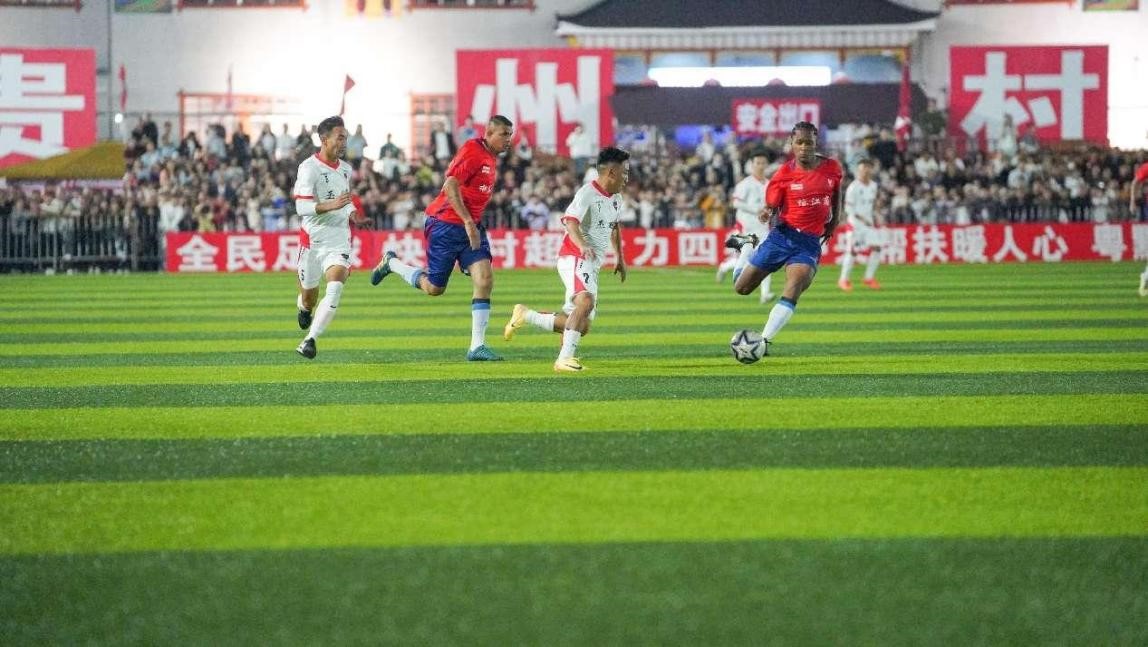 Chinese and Brazilian players compete in a friendly soccer game hosted by the Village Super League in southwest China's Guizhou province, Oct. 4, 2024. (People's Daily Online/Zhou Guangsheng)
