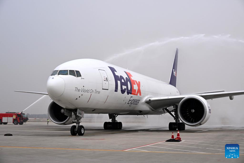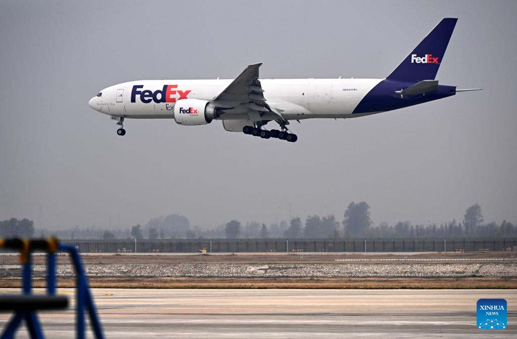 A FedEx cargo flight arrives at Qingdao Jiaodong International Airport in Qingdao, east China's Shandong Province, Nov. 11, 2024. (Xinhua/Li Ziheng)