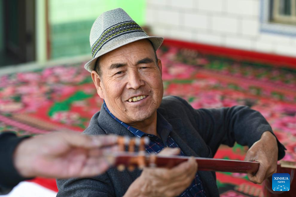 Nurdun Esmayil (C) plays music with his son, Ehmet Nurdun (L), and his apprentice in his courtyard in Xinhe County, northwest China's Xinjiang Uygur Autonomous Region, Oct. 15, 2024. (Xinhua/Chen Shuo)