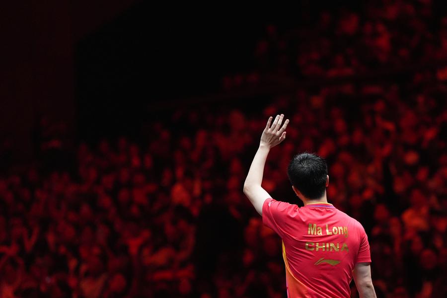 Ma Long of China greets spectators after his men's singles final against his compatriot Lin Shidong at the 2024 World Table Tennis (WTT) China Smash in Beijing on Oct. 6, 2024. (Xinhua/Ju Huanzong)