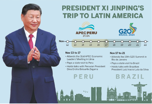 Xi embarked on the landmark trip to Peru and Brazil on Wednesday, his sixth visit to the region since 2013, for the 31st APEC Economic Leaders' Meeting in Lima and the 19th G20 Summit in Rio de Janeiro. He will also make state visits to the two nations.