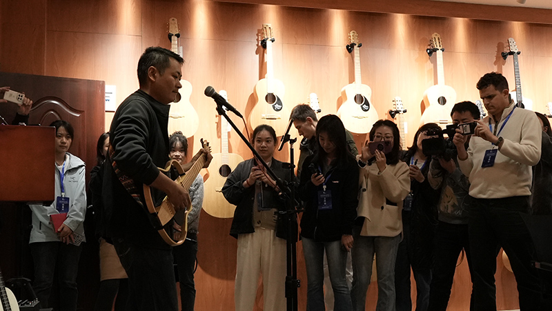 Journalists watch a guitar performance at the Zheng'an Guitar Industrial Park in Zheng'an county, Zunyi city, southwest China's Guizhou Province. (Photo provided by organizer of the reporting activity)