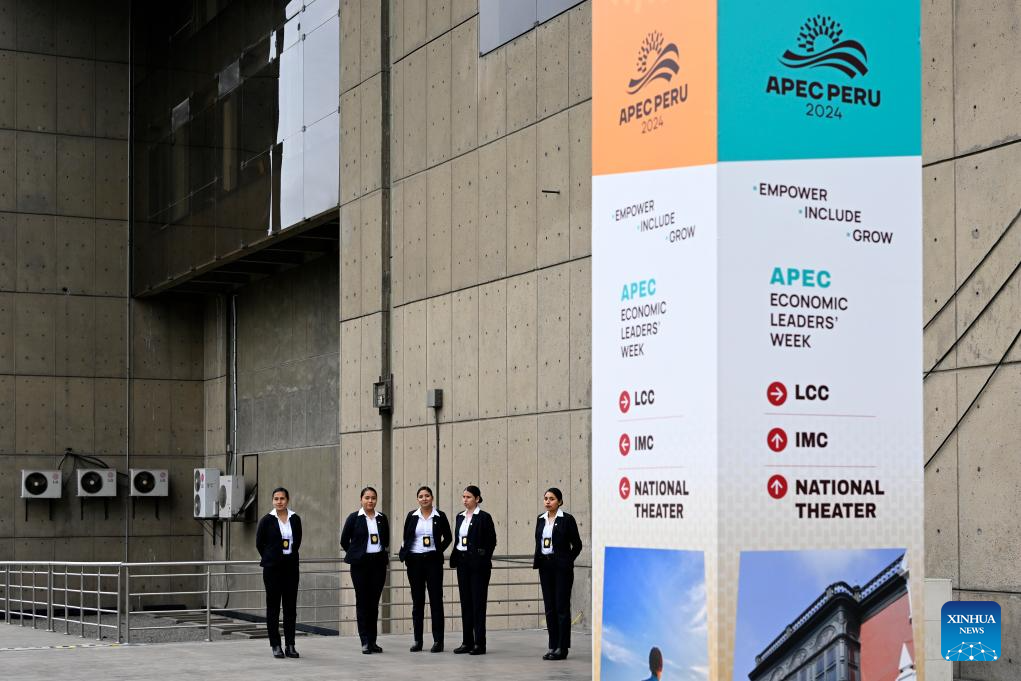 Security personnel guard outside the venue of the 31st APEC Economic Leaders' Meeting in Lima, Peru, Nov. 12, 2024. The 31st APEC Economic Leaders' Meeting will be held in Lima. (Xinhua/Li Muzi)