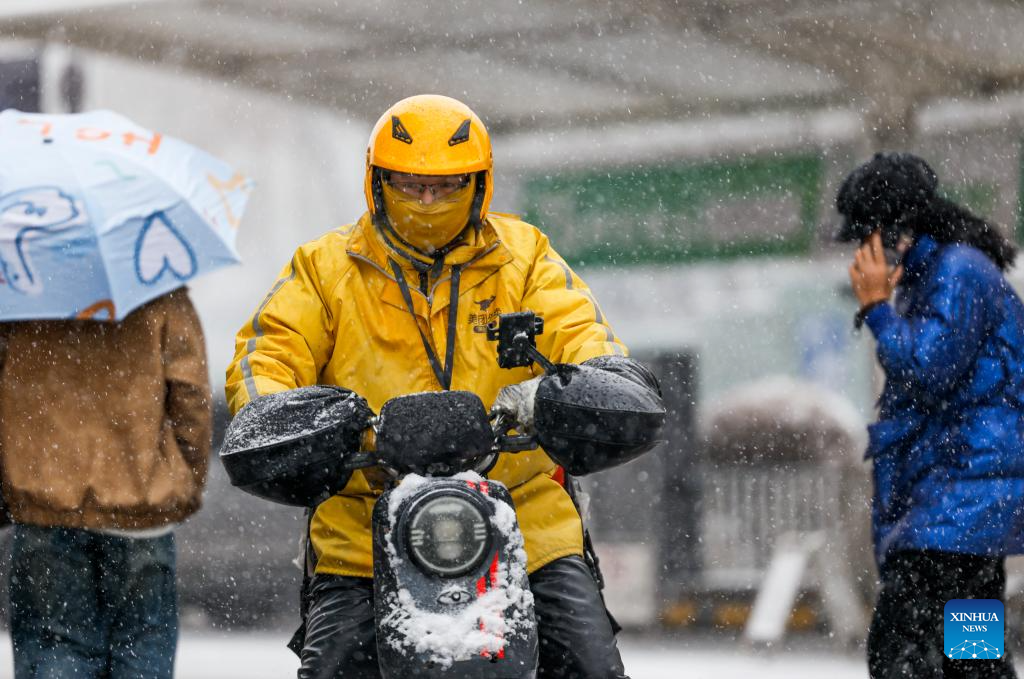 A deliveryman rides in snow in Urumqi, northwest China's Xinjiang Uygur Autonomous Region, Nov. 14, 2024. A cold front has ushered in significant drop in temperature and snowfall across Xinjiang. (Xinhua/Wang Fei)