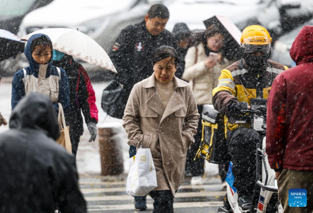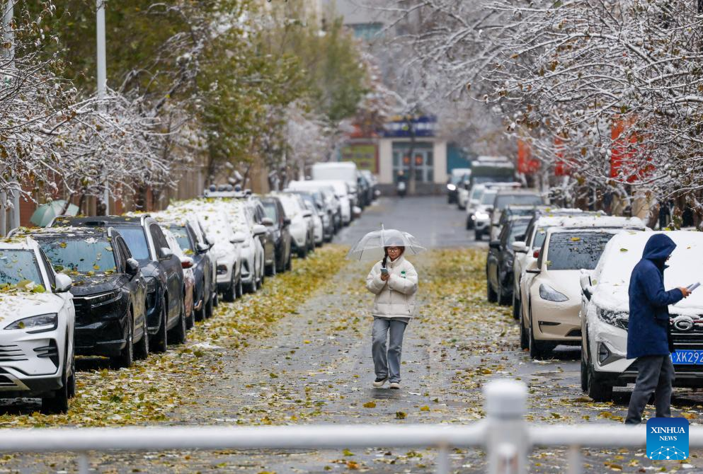 People walk in snow in Urumqi, northwest China's Xinjiang Uygur Autonomous Region, Nov. 14, 2024. A cold front has ushered in significant drop in temperature and snowfall across Xinjiang. (Xinhua/Wang Fei)