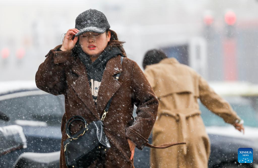 People walk in Urumqi, northwest China's Xinjiang Uygur Autonomous Region, Nov. 14, 2024. A cold front has ushered in significant drop in temperature and snowfall across Xinjiang. (Xinhua/Wang Fei)