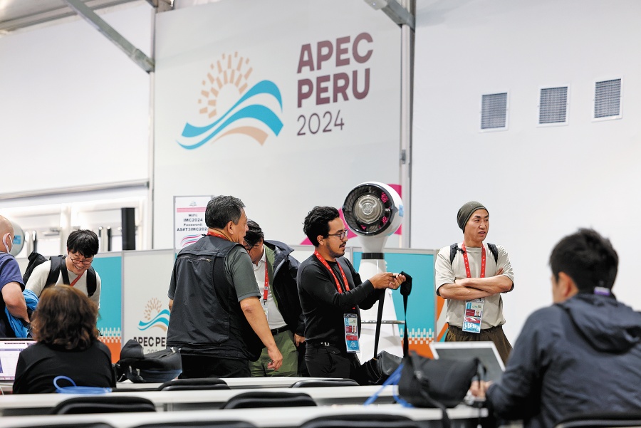 Journalists work on Wednesday at the APEC 2024 International Media Center in Lima, Peru. The APEC Economic Leaders' Week started on Sunday, and the 31st APEC Economic Leaders' Meeting will be held on Saturday. (FENG YONGBIN/CHINA DAILY)