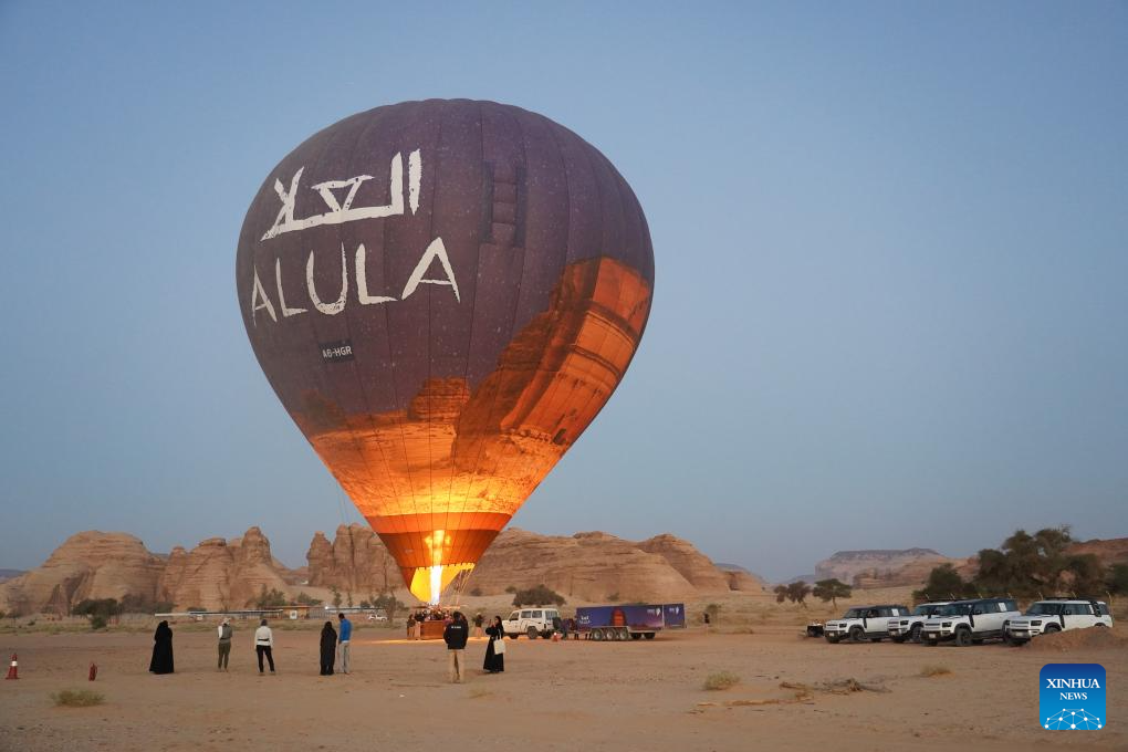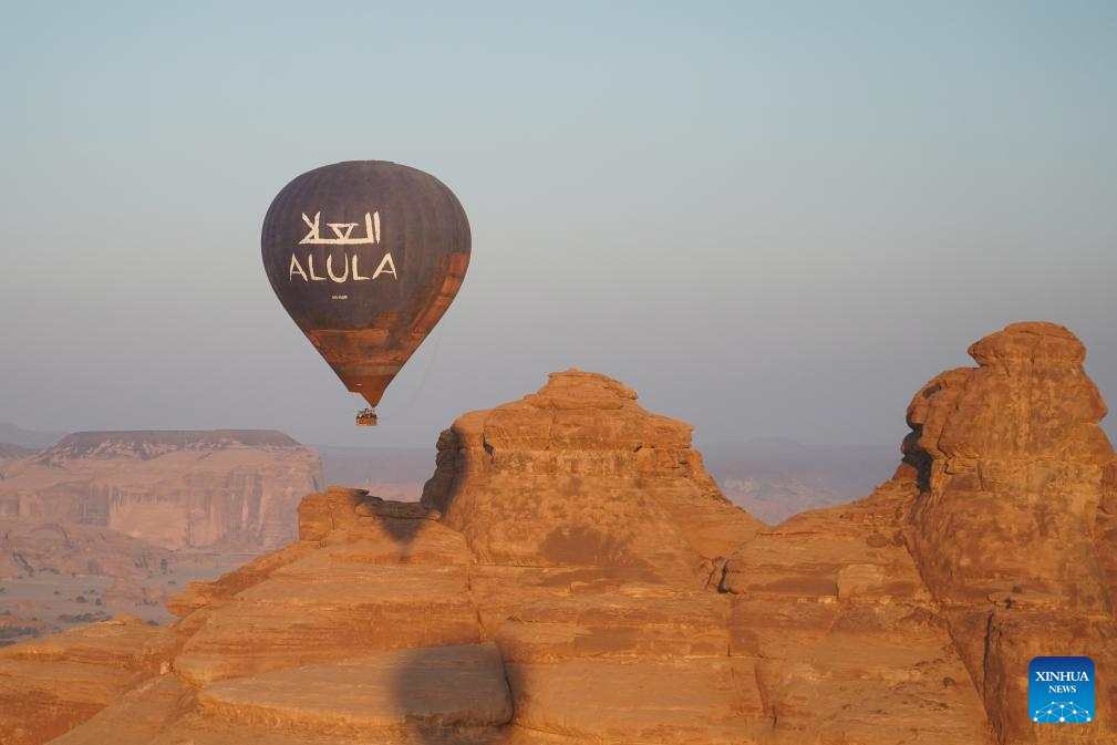 Tourists take a ride in a hot air balloon in AlUla, Saudi Arabia, Nov. 16, 2024. Themed "Hegra Sunrise Sky Tour," a hot air balloon event took place on Saturday at Hegra, a UNESCO World Heritage Site in AlUla. (Xinhua/Luo Chen)