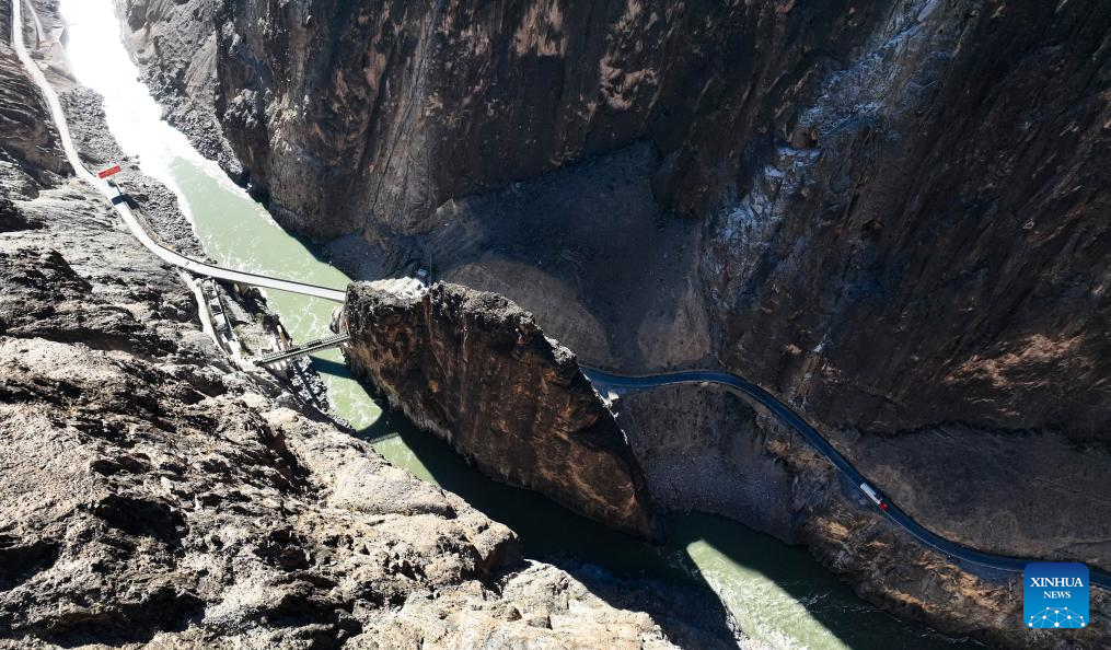 An aerial drone photo taken on Nov. 16, 2024 shows the Nujiang Bridge on the Sichuan-Xizang highway in Baxoi County, southwest China's Xizang Autonomous Region. (Xinhua/Yang Fan)
