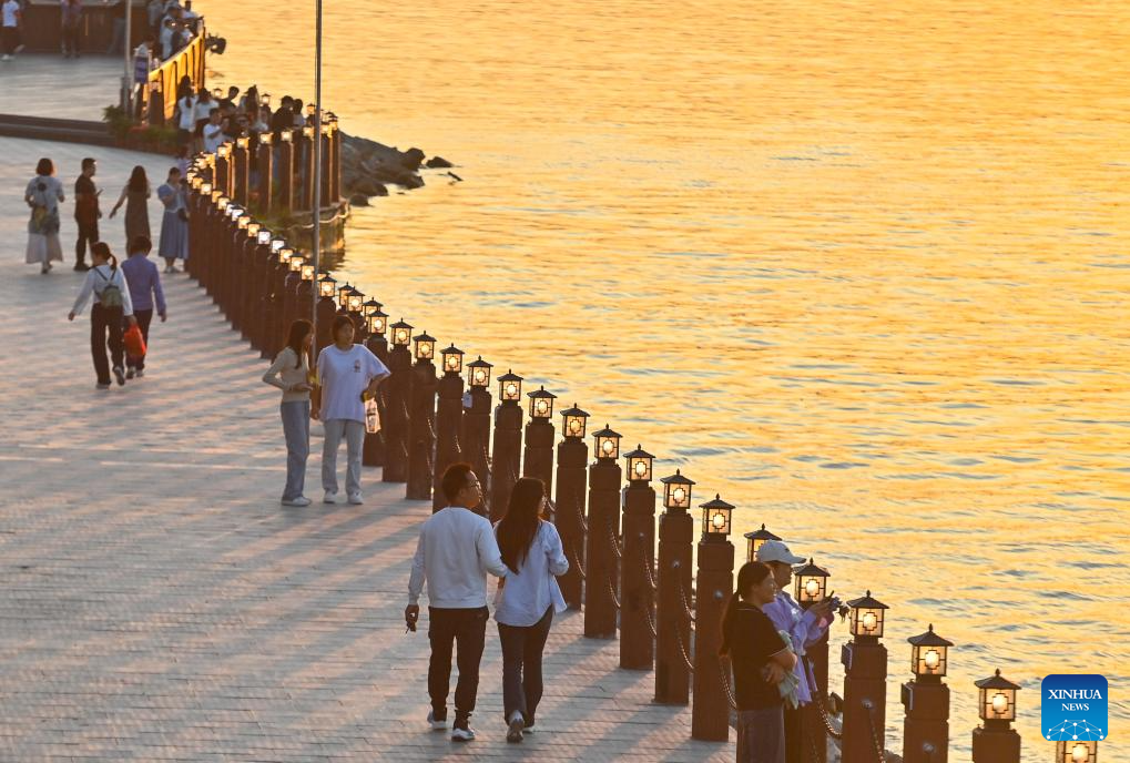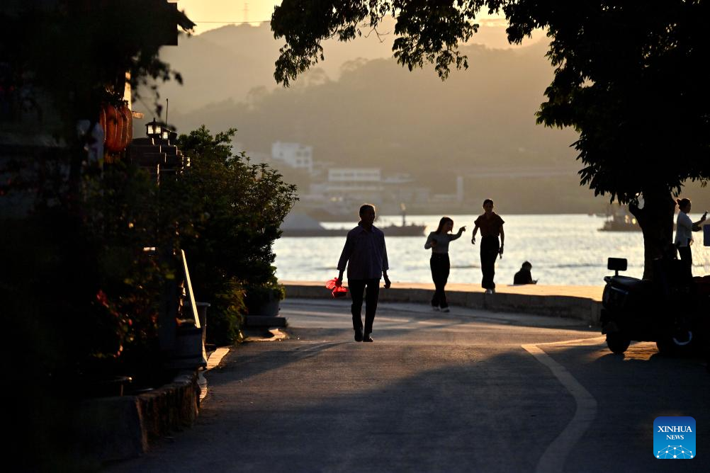 Tourists enjoy the sunset scenery at Sizhou Village in Changzhou District of Wuzhou City, south China's Guangxi Zhuang Autonomous Region, Nov. 14, 2024. Located on the Sizhou Island in Xijiang River and bestowed with rich intangible cultural heritage and beautiful natural scenery, Sizhou Village has become a famous tourism attraction.