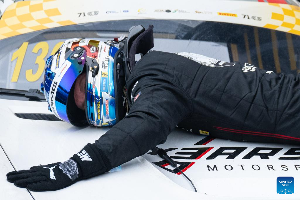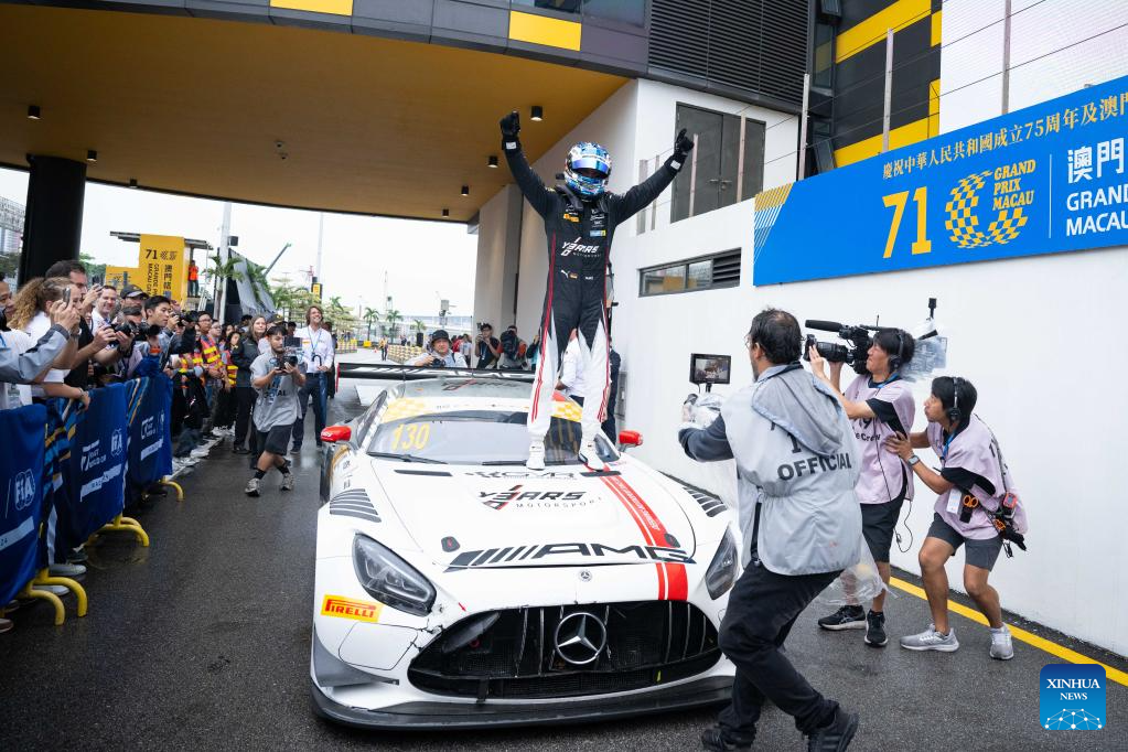 Maro Engel of Germany celebrates after the Macao GT Cup-FIA GT World Cup race at the 71st Macao Grand Prix in Macao, south China, Nov. 17, 2024. (Xinhua/Cheong Kam Ka)