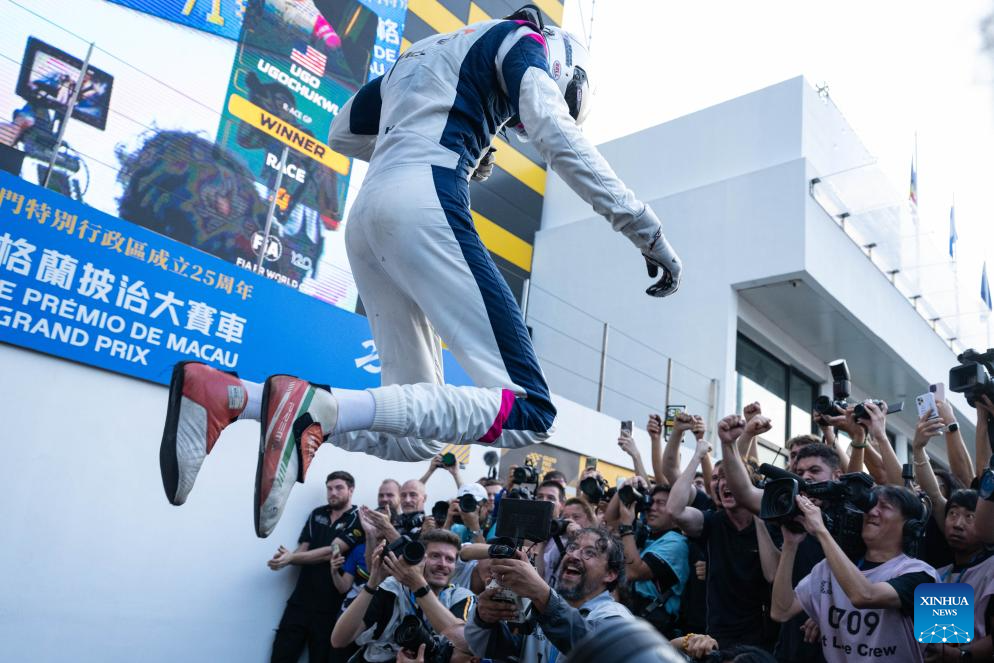 Ugo Ugochukwu (top) of the United States celebrates after winning the FIA FR World Cup race at the 71st Macao Grand Prix in Macao, south China, Nov. 17, 2024. (Xinhua/Cheong Kam Ka)