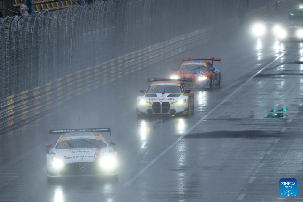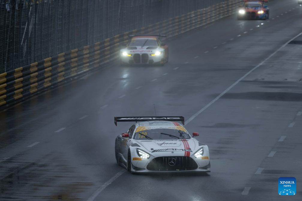Maro Engel (front) of Germany drives during the Macao GT Cup-FIA GT World Cup race at the 71st Macao Grand Prix in Macao, south China, Nov. 17, 2024. (Xinhua/Cheong Kam Ka)