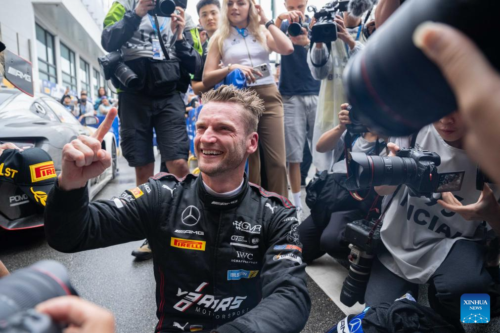 Maro Engel (C) of Germany reacts after the Macao GT Cup-FIA GT World Cup race at the 71st Macao Grand Prix in Macao, south China, Nov. 17, 2024. (Xinhua/Cheong Kam Ka)