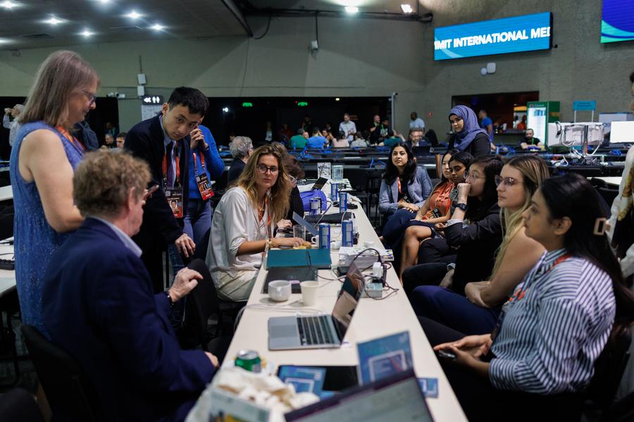 Journalists work at the G20 International Media Center in Rio de Janeiro, Brazil, on Nov. 17, 2024. (Photo by Claudia Martini/Xinhua)